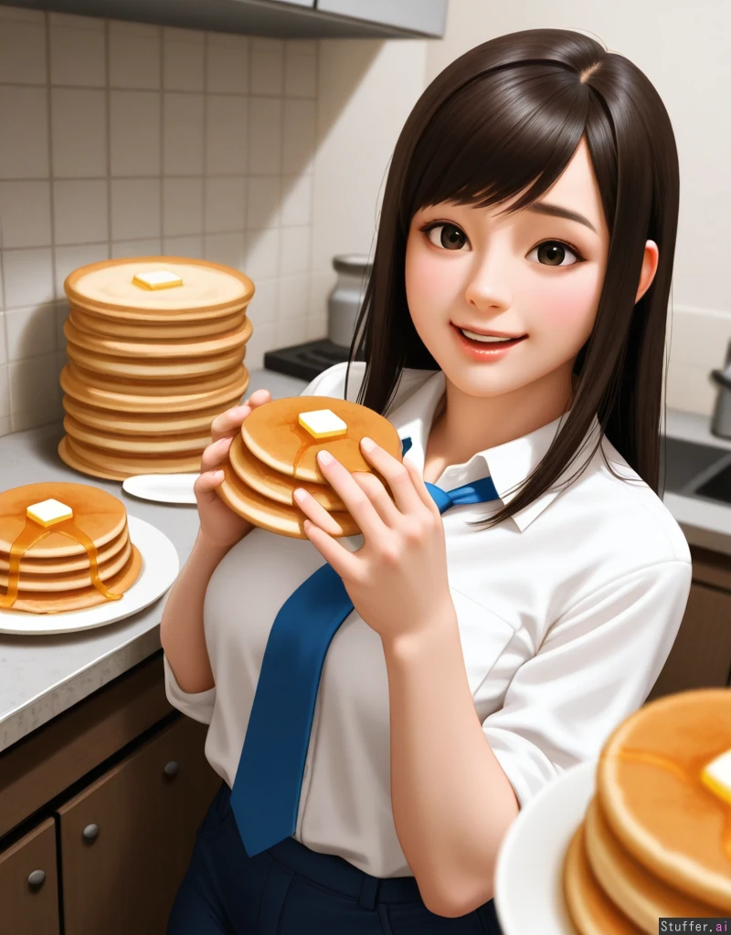Mei_(overwatch), (Asian features) 25 years old, solo, in a kitchen, surrounded by food, pancake_stacks, tight_outfit, beautiful_face, photorealistic, detailed, detailed eyes, alone, (detailed face)), button up shirt, tie, pants, ((no tattoo, no helmet, no braids, straight hair)), excited