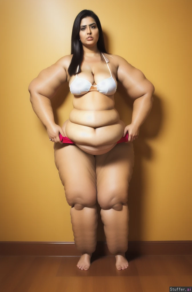 realistic, high quality, latina bbw, wearing a white bikini, (ultra huge arms:1.9), (ultra huge legs:1.9), (ultra leg rolls:1.6), (ultra arm roll:1.5), bare feet:1.5