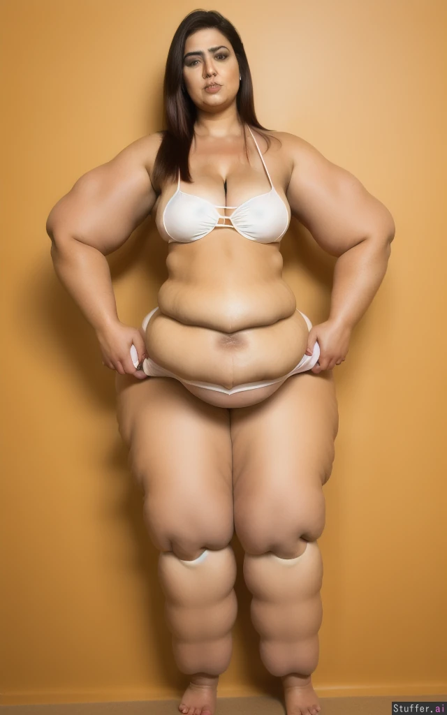 realistic, high quality, latina bbw, wearing a white bikini, (ultra huge arms:1.9), (ultra huge legs:1.9), (ultra leg rolls:1.7), (ultra arm roll:1.5), bare feet:1.5