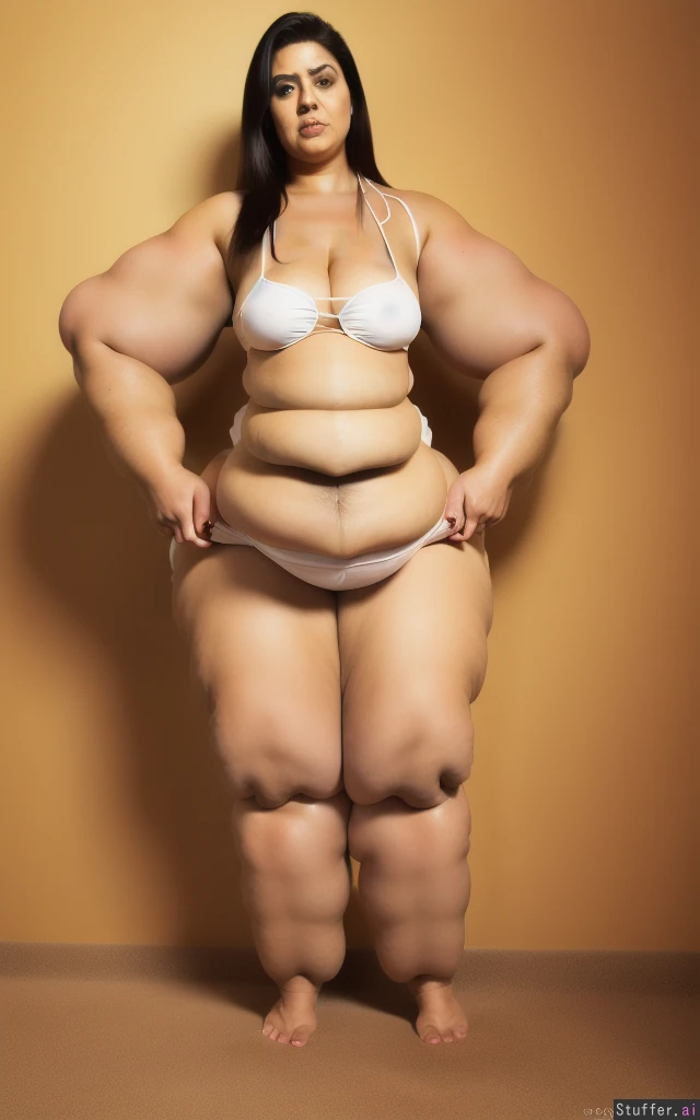 realistic, high quality, latina bbw, wearing a white bikini, (ultra huge arms:1.9), (ultra huge legs:1.9), (ultra leg rolls:1.8), (ultra arm roll:1.5), bare feet:1.5