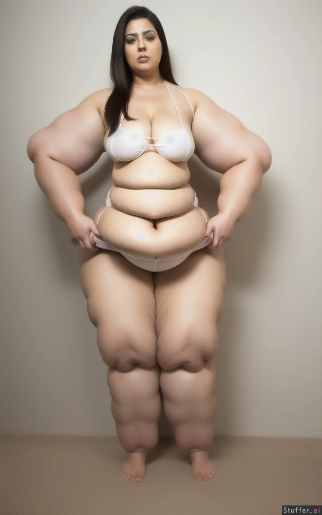 realistic, high quality, latina bbw, wearing a white bikini, (ultra huge arms:1.9), (ultra huge legs:1.9), (ultra leg rolls:1.8), (ultra arm roll:1.5), bare feet:1.5
