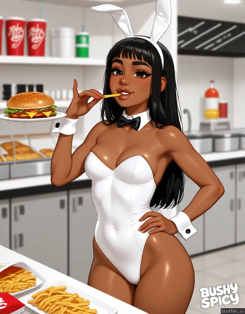 uhd, high resolution, flawless, best quality, ((realistic, photorealistic)) one woman, ((tall African-American woman, African brown skin)), plump lips, small eyes, freckled skin, solo, long straight raven hair, bangs, thick eyebrows, detailed brown eyes, realistic_face)), ((highly detailed face)), blushyspicy(artist), well lit, (white playboy bunny costume, fake bunny ears, black bow tie), (in a historic dining hall, many big burgers, fries, large sodas, surrounded by fast-food), (cute_facial_expression), (larger lower lip, happy, small eyes) ((skinny)), narrow_hips, narrow_waist, skinny_legs, small_breasts, ((eating big burgers, large sodas)),