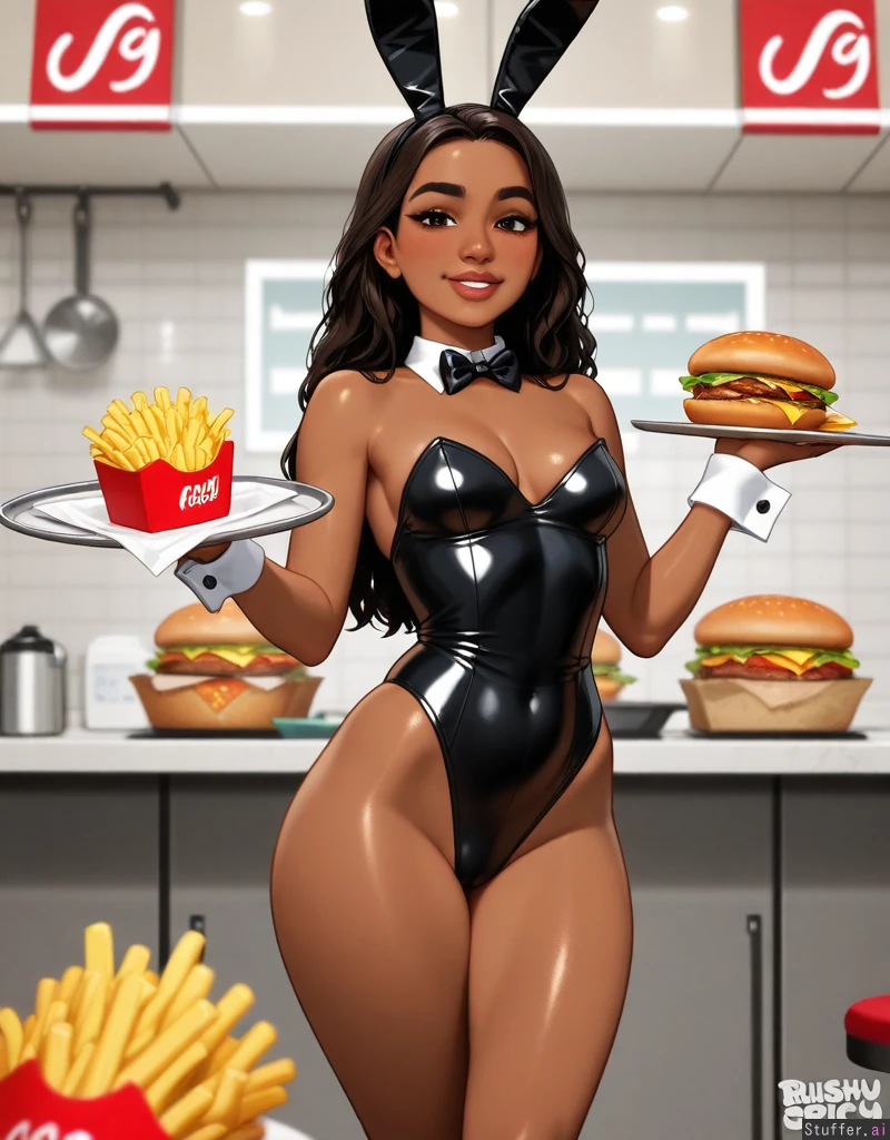 uhd, high resolution, flawless, best quality, ((realistic, photorealistic)) one woman, ((tall African-American woman, African brown skin)), plump lips, small eyes, freckled skin, solo, long straight raven hair, bangs, thick eyebrows, detailed brown eyes, realistic_face)), ((highly detailed face)), blushyspicy(artist), well lit, (white playboy bunny costume, fake bunny ears, black bow tie), (in a historic dining hall, many big burgers, fries, large sodas, surrounded by fast-food), (cute_facial_expression), (larger lower lip, happy, small eyes) ((skinny)), narrow_hips, narrow_waist, skinny_legs, small_breasts, ((eating big burgers, large sodas)),