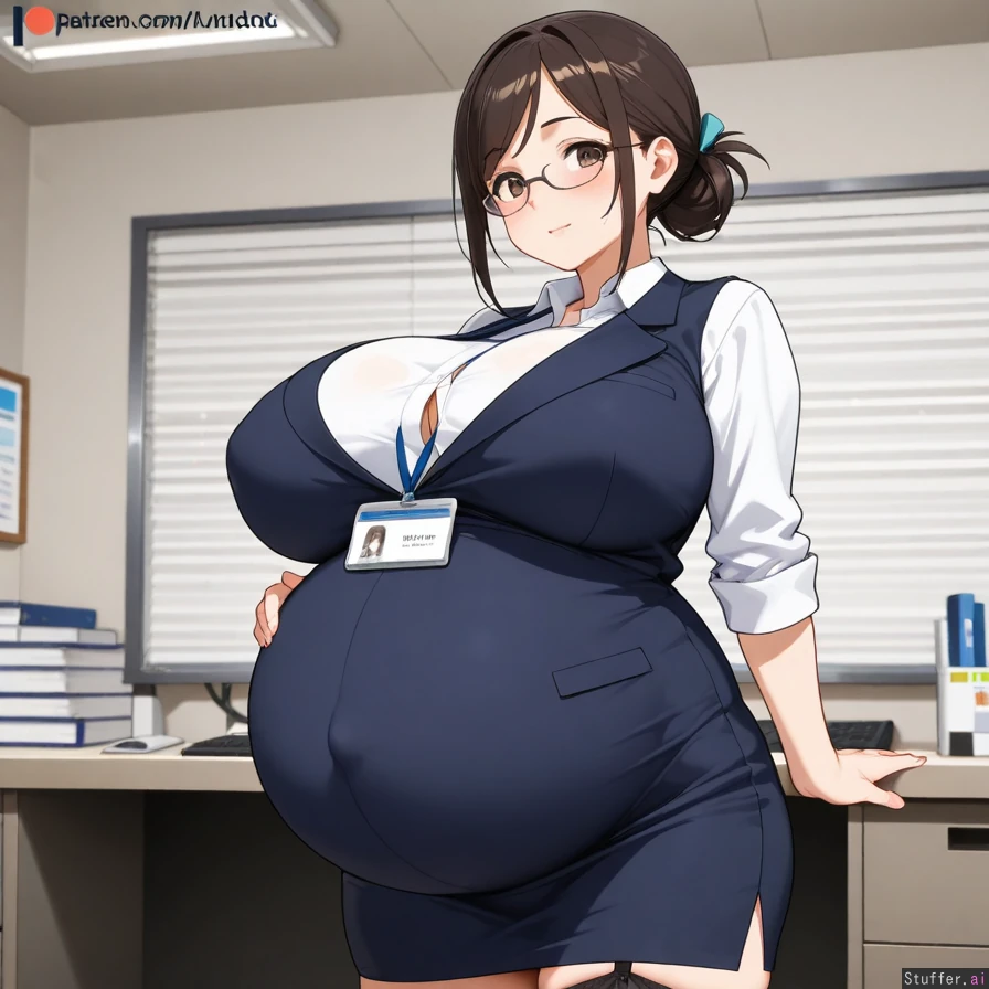 1 girl, best quality, highest rating, 8k, UHD, woman, Japanese office worker, mid twenties. Overweight. Heavily pregnant. Massive breasts. Wearing a garter.