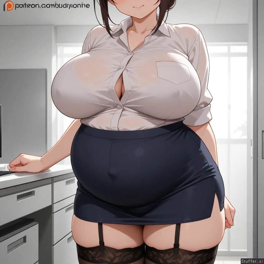 1 girl, best quality, highest rating, 8k, UHD, woman, Japanese office worker, mid twenties. Overweight. Heavily pregnant. Massive breasts. Tight mini skirt. White shirt. Wearing a garter.