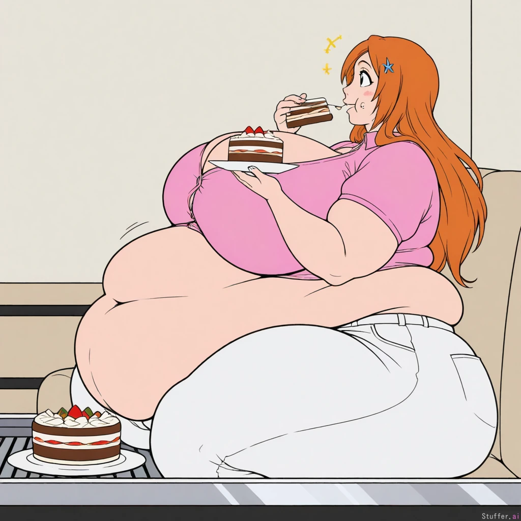 1girl ,((flat art , flat colors , bleach style)),((inoue_orihime_(bleach) , ripped pink shirt , exposed belly , ripped white pants , (tall) , sexy , beautiful)) , ((curvy , voluptuous , thicc , huge breasts , wide hips , thick thighs , morbidly obese , hyper obese body , massive fat body)) , ((in a living room , side view , sitting on a sofa , cheerfull happy face , satisfied face , adicted to food , a conveyor belt is bringing her tons of cakes , eating joyfully , enjoying eating , immobile fatty))