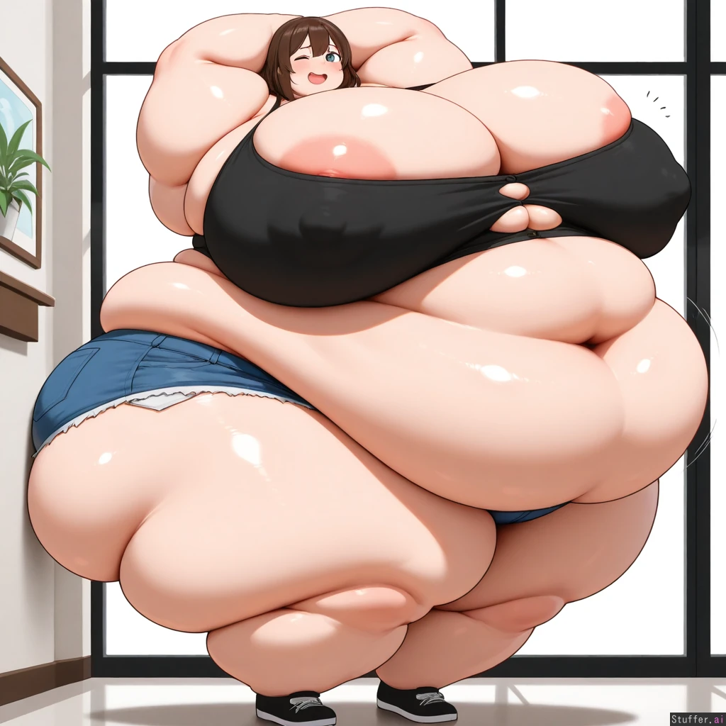 uhd, high resolution, flawless, best_quality, (Solo), (1girl), (looking_at_viewer:1.2) (hdr), belly, big belly, blue eyes, breasts, brown hair, button gap, cleavage, covered erect nipples, crop top, cutoffs, fat, fat woman, from side, large breasts, medium hair, navel, obese, one eye closed, open mouth, short shorts, shorts, sleeveless, smile, solo, standing, thick arms, thick thighs, thighs, white background, wink, arms above head (extremely_toned_body:1.2), (morbidly_obese:1.6), (Fat Arms:1.6), (gigantic_fat_thighs:1.6), (tall female:1.2), (gigantic breasts:1.4), (sagging breasts:1.2), (big_fat_ass:1.4), (enormous wide hips:1.4), (big round bloated belly:1.0), (fat_rolls:1.4) (fully_clothed:1.8), full body shot, (detailed background:1.6), ((nipples slip, embarrassed , deep navel)), , ( colossal breasts:1.4 ), motion_lines , breasts pressed together ,(( view from below :1.4))