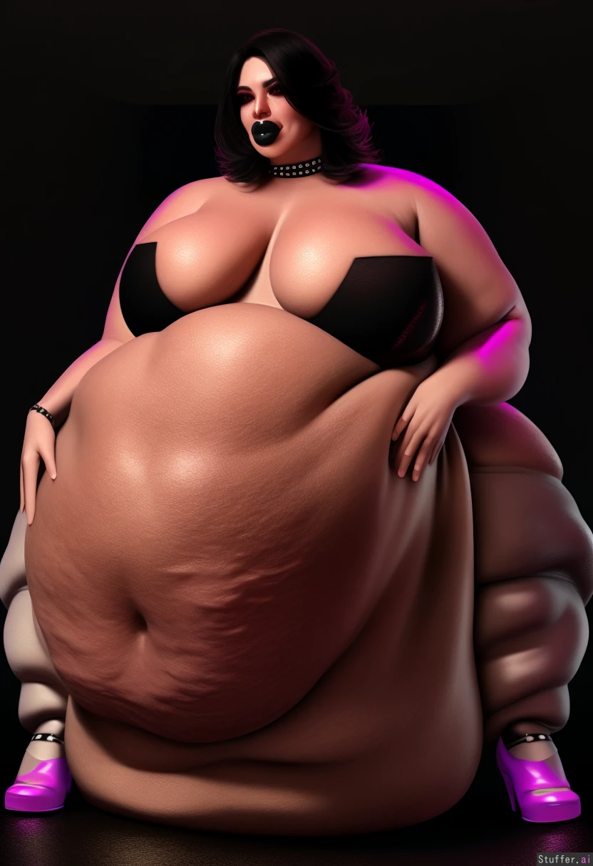 best quality, high rating, (best quality, high rating, UHD, HDR, 8k resolution, ultra high res, definition lines), (masterpiece), (perfect anatomy), clear color, Wonderful coloring, Wonderful linework, highlight, high quality girl face, high detailed girl face, big fat lips on the belly, Anatomically detailed cute face,Licking his lips,goth girl, solo girl,30 years old,full body,(realistic skin, visible veins) obese,fat rolls,double belly,((belly touch the ground)),chains,choker, short dark hair,((big fake lips)),red eyes,shoes and stockings, tall height, fat ass with cellulite, (extremely morbidly obese, huge hyper saggy belly),sweating,((morbidly_obese)), ((immobille)), torn latex costume, ((perfect anatomy)