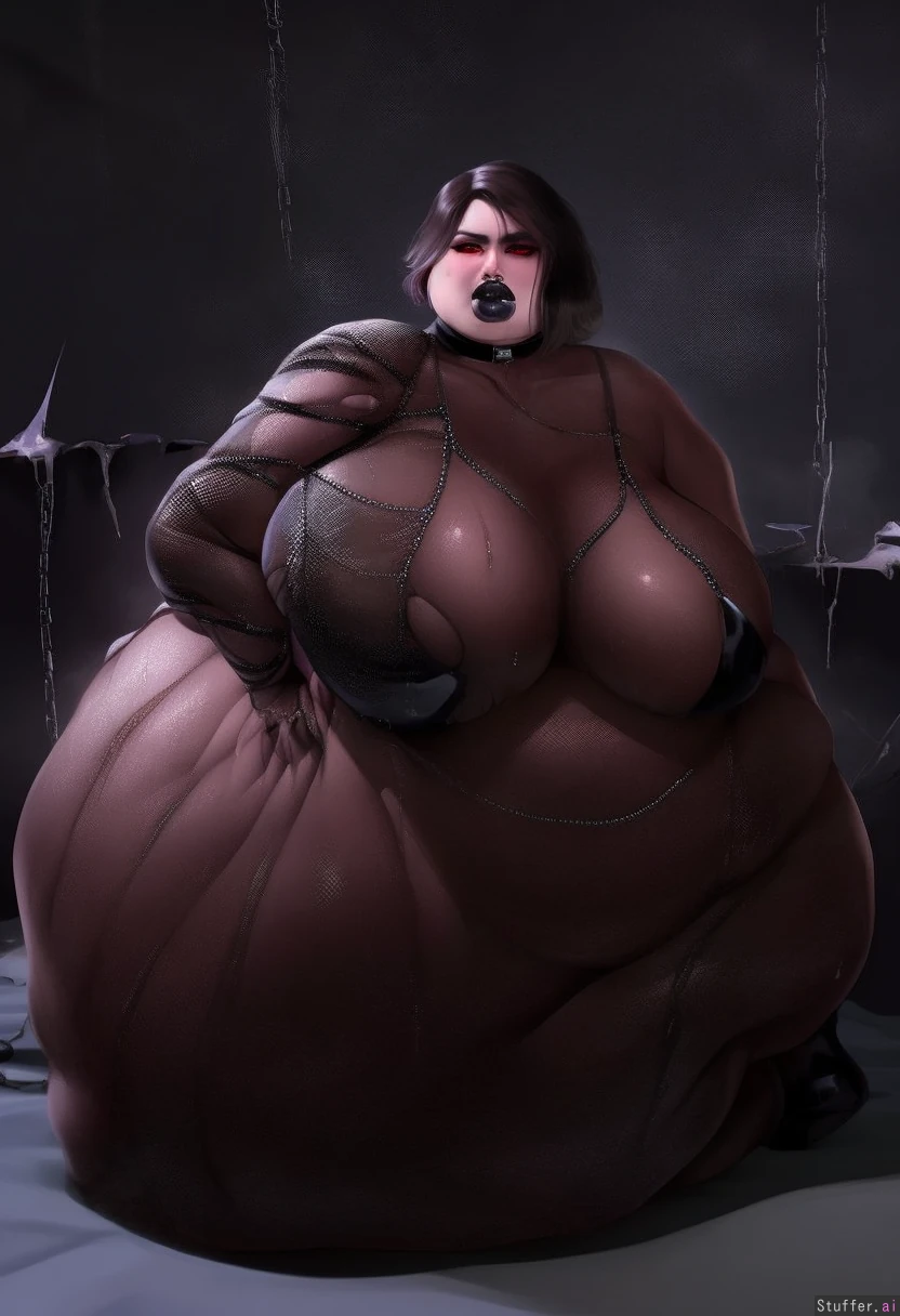 best quality, high rating, (best quality, high rating, UHD, HDR, 8k resolution, ultra high res, definition lines), (masterpiece), (perfect anatomy), clear color, Wonderful coloring, Wonderful linework, highlight, high quality girl face, high detailed girl face, ((Anatomically detailed face),goth girl, solo girl,30 years old,full body,(realistic skin, visible veins) obese,fat rolls,double belly,chains,choker, short dark hair,((big fake lips)),red eyes,shoes and stockings, tall height, fat ass with cellulite, (extremely morbidly obese, huge hyper saggy belly),sweating,((morbidly_obese)), torn latex costume, ((perfect anatomy)