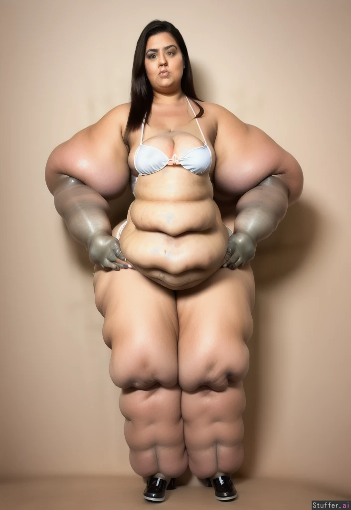 realistic, high quality, latina bbw, wearing a white bikini, (ultra huge arms:1.9), (ultra huge legs:1.9), (ultra leg rolls:1.8), (ultra fat legs:1.8), (ultra arm roll:1.5), bare feet:1.5, (small breasts:1.4)