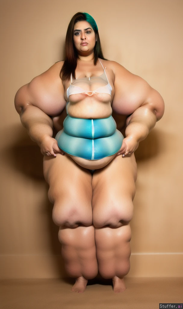 realistic, high quality, latina bbw, wearing a white bikini, (brown hair:1.4), (ultra huge arms:1.9), (ultra huge legs:1.9), (ultra leg rolls:1.8), (ultra fat legs:1.8), (ultra arm roll:1.5), bare feet:1.5, (small breasts:1.4)