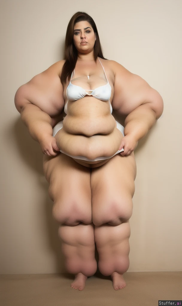 realistic, high quality, latina bbw, wearing a white bikini, (brown hair:1.4), (ultra huge arms:1.9), (ultra huge legs:1.9), (ultra leg rolls:1.8), (ultra fat legs:1.8), (ultra arm roll:1.5), bare feet:1.5,