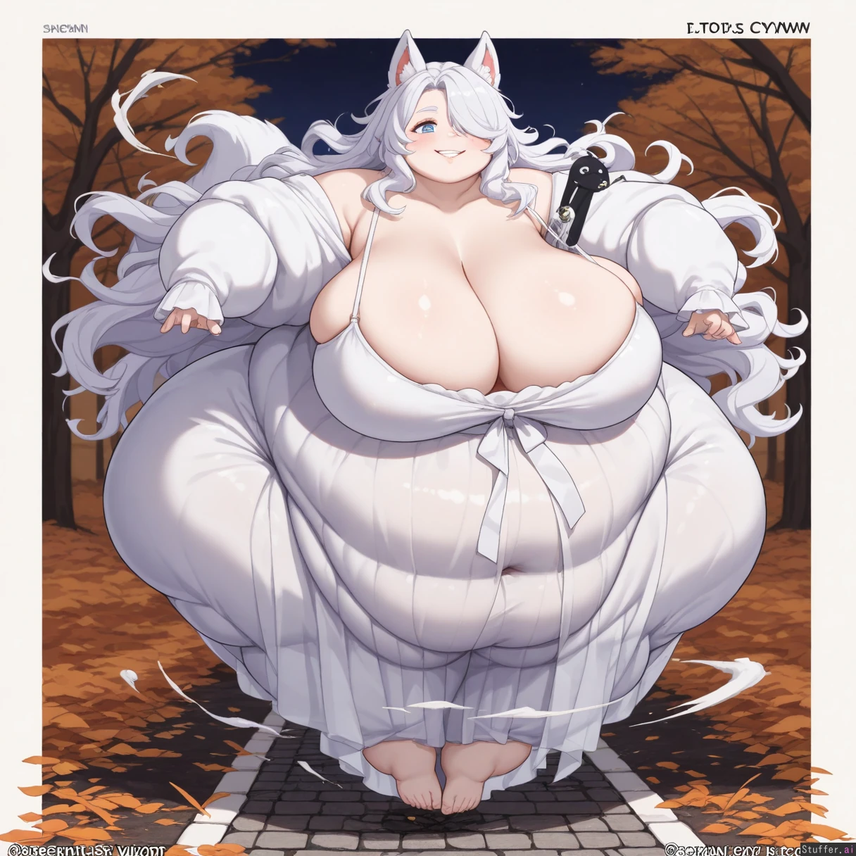 (best quality, high rating, UHD, HDR, 8k resolution, ultra high res, definition lines), (masterpiece), (perfect anatomy), clear color, Wonderful coloring, Wonderful linework, highlight, nice lighting, nice shadow, high quality anime girl face, high detailed anime girl face, high quality anime girl pupils, high detailed anime girl pupils, Anatomically detailed fat cute face, solo 1 white wolf girl, (At night:1.5), cute, pretty, young adult, beautiful, (7 feet tall), wider than taller, Name character : Cyann, (She is a white wraith wolf woman with very white wraith skin:1.5), (white wolf ears), (White wolf tail), high detailed cute Cyann, (([on levitating:1.8], colossal hyper extremely immobile huge morbidly obese fat massive ussbbw beauty woman:1.5)), (Fat huge immobile long wide shoulders, fat huge morbidly obese massive full arms, fat chest, chubby breasts, Massive hyper Wide hyper gigantic hips, immobile huge fat wide morbidly obese long overflowing belly, big massive large bulging waistline, very wide huge waist, hyper immobile fat sides:1.3), (Gigantic colossal ass, hyper Massive wide thighs, morbidly obese immobile wide colossal legs, pretty huge wide chunky calves, Massive wide fat back, massive huge hyper colossal shoulder, hyper huge immobile long wide backfat, immobile backsides:1.3), (cute very fat wide face, cute cheeky chubby wide fat head stuck in fat, full wide saggy sublte double chins, full curvy lips, bigger huge colossal lowerlip, voluptuous full face, fat colossal overflowing mutiple chin, soft blushy wide full cheeks, chubby full envelopping tubby immobile neck, very full immobile overloaded throat, very engulfed immobile chubby jaw:1.3), freckles nose, face freckles, , morbidly obese deep arm sag, fat obese tubby flabby arms, fat morbidly chubby hands, fat chunky tubby fingers, Big Soft wide lovehandles, cute navel, slim forearms, fat blushed folded elbows, blushed knees, huge massive tubby cankles, fat wide overengulfed plump feet, overspreaded toes, obese calves, huge butt, huge hyper tummy, huge shoulder fat, massive gigantic backfat behind, ((extra wide massive immobile long white very transparent dress even for boobs:1.5)), (obese wide bare levitating feet under her transparent dress:1.3), (cleavage, dress covering all of her immobile body, torn long train's white dress hanging out:1.3), Shiny skin, smooth skin, soft skin, Smooth fat curvy, (Sandersonia white hair) (massive long white overflowing wavy hair, wavy sided white hair over one eye:1.5), white eyebrows, (white hair only), (Downturned cute cyan blue eyes, long eyes:1.3), (In autumn, at night:1.5), ((on stony road:1.5)), (foggy:1.5), ((She is levitating In air:1.8)), ((Crushing Cute spooky pose, colossal morbidly obese immobile rawring face engulfed into immobile colossal shoulder:1.5)), ((flirting, try to scare you:1.2)), (Spoky loving turning on expression, seductive gaze, shy smile, breathing heavily, open drooling in love), (Motion lines, bouncing effect), (((Own_Cyann_view:2.0))), [(())], ((perfect anatomy), high resolution c.cu(artist), (high resolution icecake(artist):1.2), ((high detailed Pixiveo(artist):1.2)), (high detailed Betterwithsalt(artist):1.2), (High resolution Davielwfries(artist):1.2)), ((((very White skinned wraith woman:1.5)))),