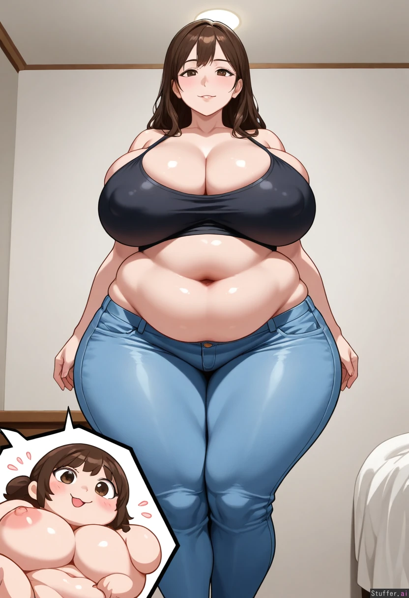 "Create an artistic representation of a tall, voluptuous woman characterized as a BBW/SSBBW. She should be confidently showcasing her soft, rounded belly that conveys warmth and comfort. Highlight her wide, plush love handles that add to her curvaceous silhouette. Emphasize her oversized belly button, making it appear deep and inviting. The setting should be bright and cheerful, enhancing her joyful demeanor. The overall mood should be body-positive and celebratory, focusing on the beauty of diverse body types." Hyper_realistic, 4k, asian, milf, bbw, chubby_belly, soft_belly, flabby_belly, (doughy_belly:1.3), wide_love_handles, plush_love_handles, pillowy_love_handles, big_navel, moist_navel, very_very_deep_navel, croptop, very_tight_jeans, standing, muffin_top (big belly:1.3), (bbw:1.6), (round belly:1.4), (big_breasts:1.8), bursting breasts, (wide hips:1.3), (big butt:1.3), (deep navel:1.5), (:1.0)}, (pov: 1.4)