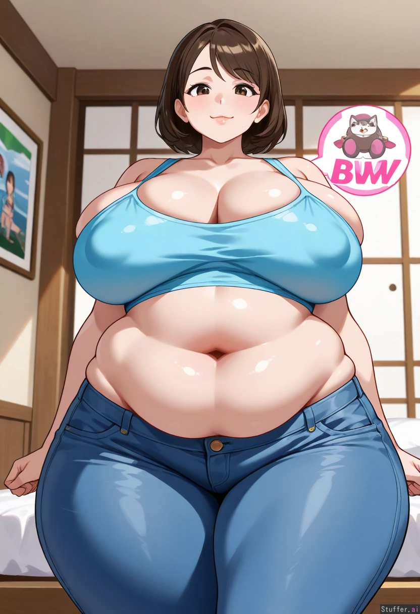 "Create an artistic representation of a tall, voluptuous woman characterized as a BBW/SSBBW. She should be confidently showcasing her soft, rounded belly that conveys warmth and comfort. Highlight her wide, plush love handles that add to her curvaceous silhouette. Emphasize her oversized belly button, making it appear deep and inviting. The setting should be bright and cheerful, enhancing her joyful demeanor. The overall mood should be body-positive and celebratory, focusing on the beauty of diverse body types." Hyper_realistic, 4k, asian, milf, bbw, chubby_belly, soft_belly, flabby_belly, (doughy_belly:1.3), wide_love_handles, plush_love_handles, pillowy_love_handles, big_navel, moist_navel, very_very_deep_navel, croptop, very_tight_jeans, standing, muffin_top (big belly:1.3), (bbw:1.6), (round belly:1.4), (big_breasts:1.8), bursting breasts, (wide hips:1.3), (big butt:1.3), (deep navel:1.5), (:1.0)}, (pov: 1.4)