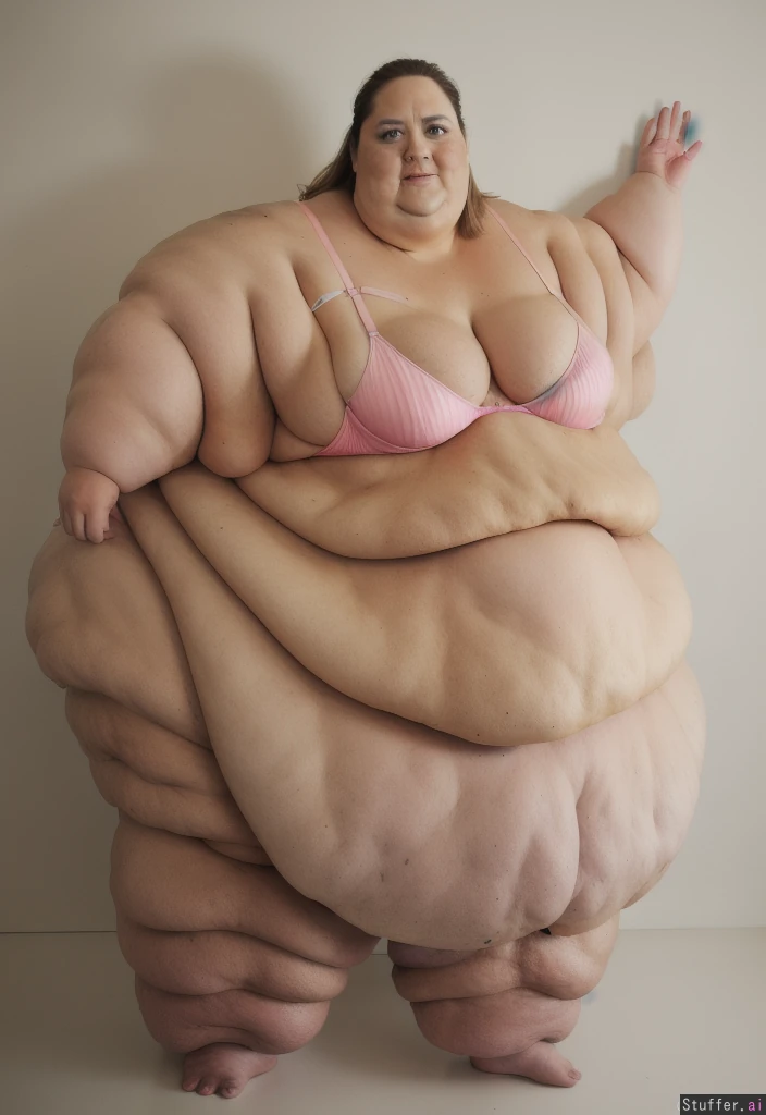 Photo realistic, highly detailed, realistic lighting, latina ssbbw, immobile, (ultra huge double chin:1.98), (ultra fat face:1.9), (wearing a pink bra:1.4), (small breasts:1.4), super ultra fat, (ultra huge arms:1.9, (ultra arm rolls:1.7, (ultra huge legs:1.9), (ultra leg rolls:1.8), blue background,
