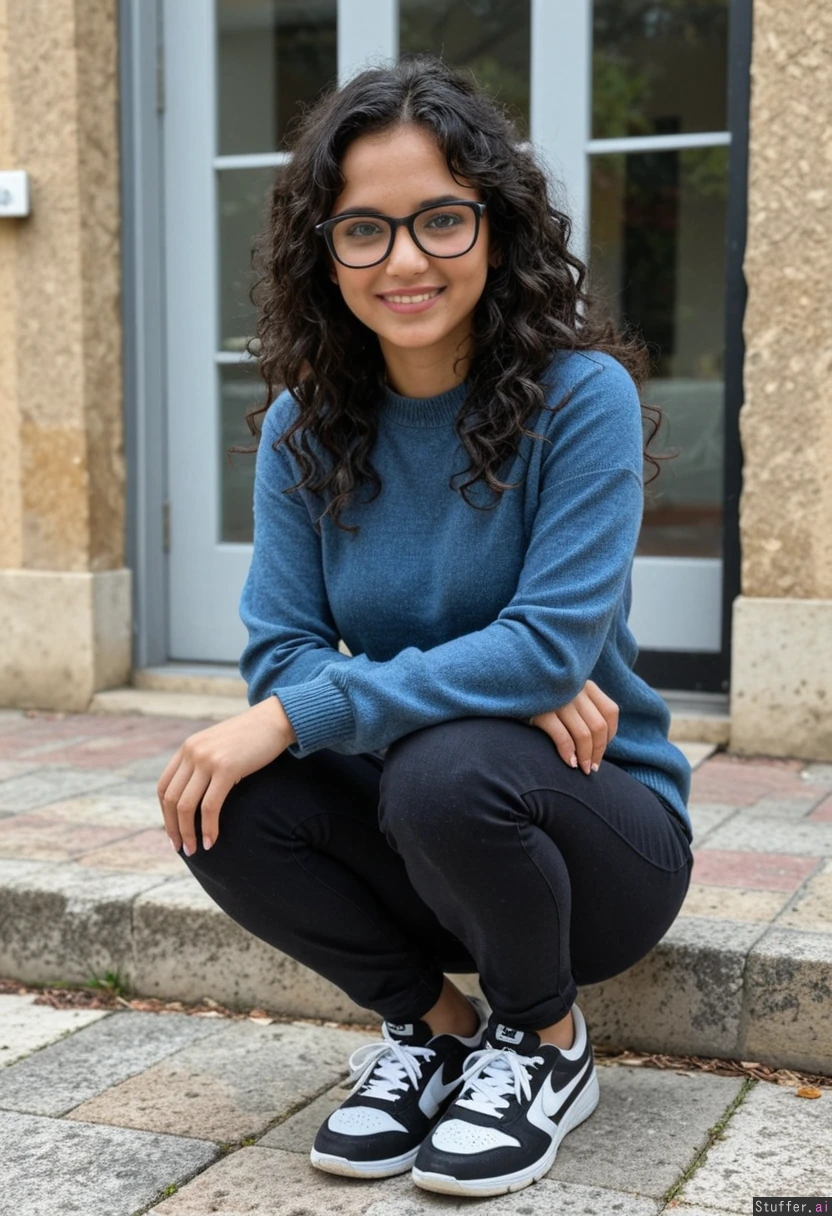 22 year old beautiful indian woman, pretty face, long curly hair, blue sweater,arms folded, smiling, glasses, in black jeans, running shoes, tall,