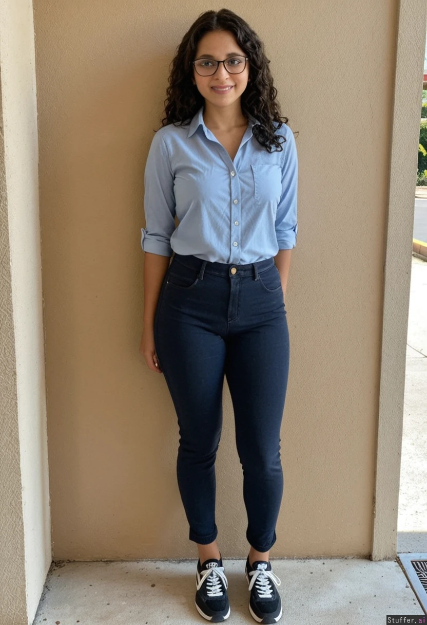 22 year old beautiful indian woman, pretty face, long curly hair, blue formal shirt, arms huge, smiling, glasses, in black jeans, running shoes, tall, standing against a wall, arms behind her back