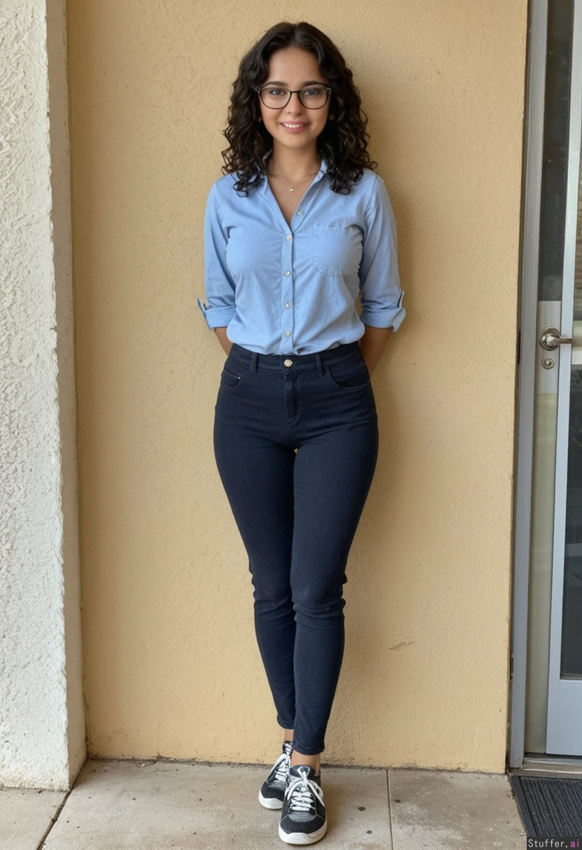 22 year old beautiful indian woman, detailed pretty face, long curly hair, blue formal shirt, arms huge, smiling, glasses, in black jeans, running shoes, tall, standing against a wall, arms tied behind her back