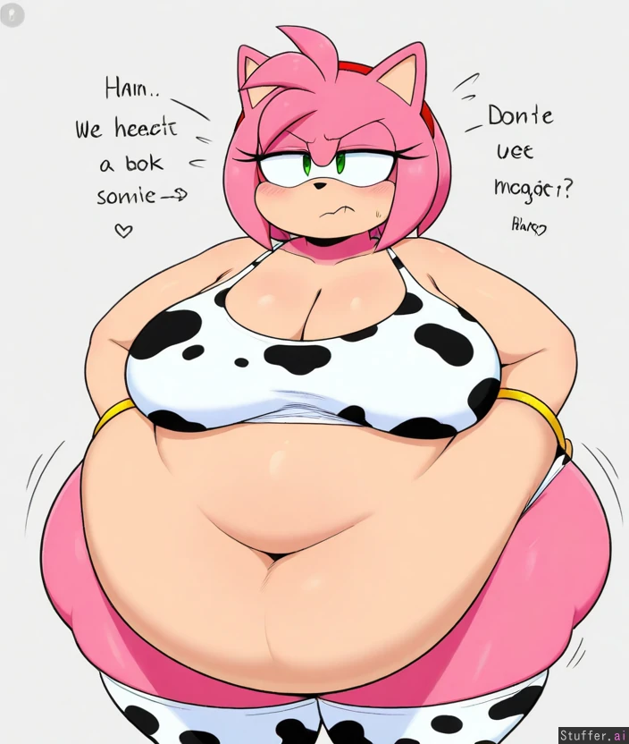 High resolution, high definition, 8k, masterpiece,art by jinusenpai, best_quality, high_rating, Amy rose, morbidly_obese_female,furry, massive_thighs:2.1, chubby_belly, chubby_female, chubby_cheeks, ssbbw,(fat_belly:1.4),(obese),full_body, (gigantic_belly:1.3),(gigantic_belly_rolls:1.5), fat round face,ssbbw, (((morbidly obese, weight gain))), (sagging breasts, fat rolls) Obese mega fat Amy Rose from Sonic the Hedgehog with a sexy cow outfit on blushing embarrassed looking angry and stroppy that she has to wear it whilst a lot of text bubbles are saying Mooo! At her. Shes saying an angry hHEY!! in response