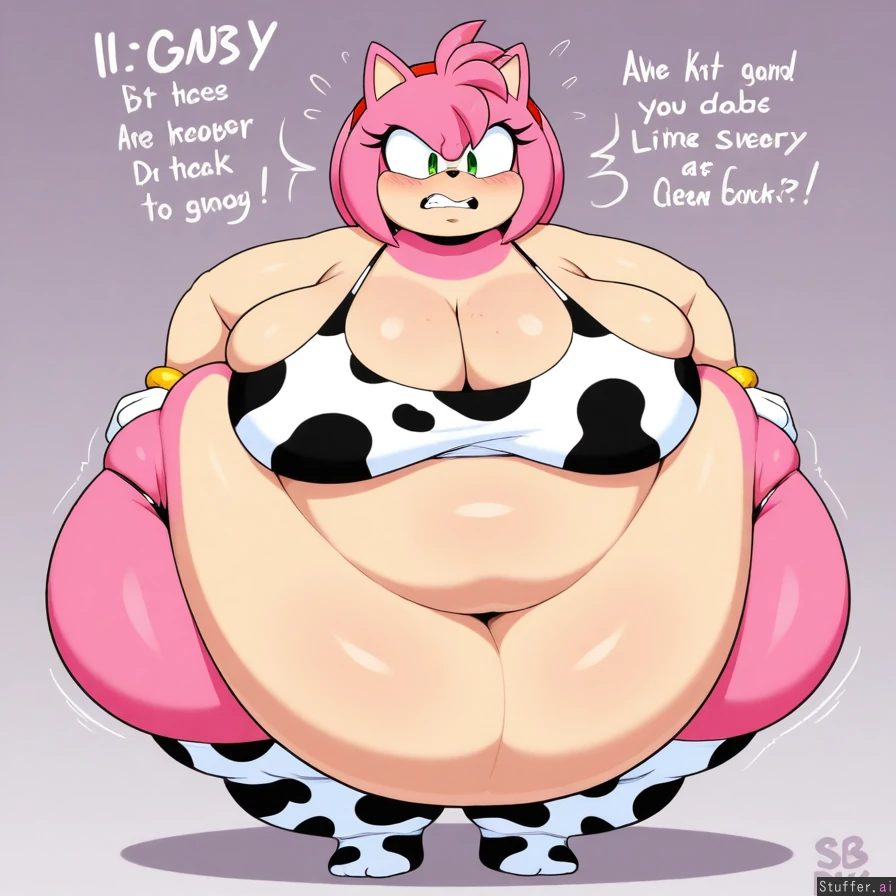 High resolution, high definition, 8k, masterpiece,art by jinusenpai, best_quality, high_rating, Amy rose, morbidly_obese_female,furry, massive_thighs:2.1, chubby_belly, chubby_female, chubby_cheeks, ssbbw,(fat_belly:1.4),(obese),full_body, (gigantic_belly:1.3),(gigantic_belly_rolls:1.5), fat round face,ssbbw, (((morbidly obese, weight gain))), (sagging breasts, fat rolls) Obese mega fat Amy Rose from Sonic the Hedgehog with a sexy cow outfit on blushing embarrassed looking angry and stroppy that she has to wear it whilst a lot of text bubbles are saying Mooo! At her. Shes saying an angry hHEY!! in response. Neon colours with purple blue and pink. Set in a dark barn.