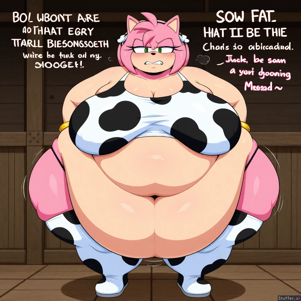 High resolution, high definition, 8k, masterpiece,art by jinusenpai, best_quality, high_rating, Amy rose, morbidly_obese_female,furry, massive_thighs:2.1, chubby_belly, chubby_female, chubby_cheeks, ssbbw,(fat_belly:1.4),(obese),full_body, (gigantic_belly:1.3),(gigantic_belly_rolls:1.5), fat round face,ssbbw, (((morbidly obese, weight gain))), (sagging breasts, fat rolls) Obese mega fat Amy Rose from Sonic the Hedgehog with a sexy cow outfit on blushing embarrassed looking angry and stroppy that she has to wear it whilst a lot of text bubbles are saying Mooo! At her. Shes saying an angry hHEY!! in response. Neon colours with purple blue and pink. Set in a dark barn.