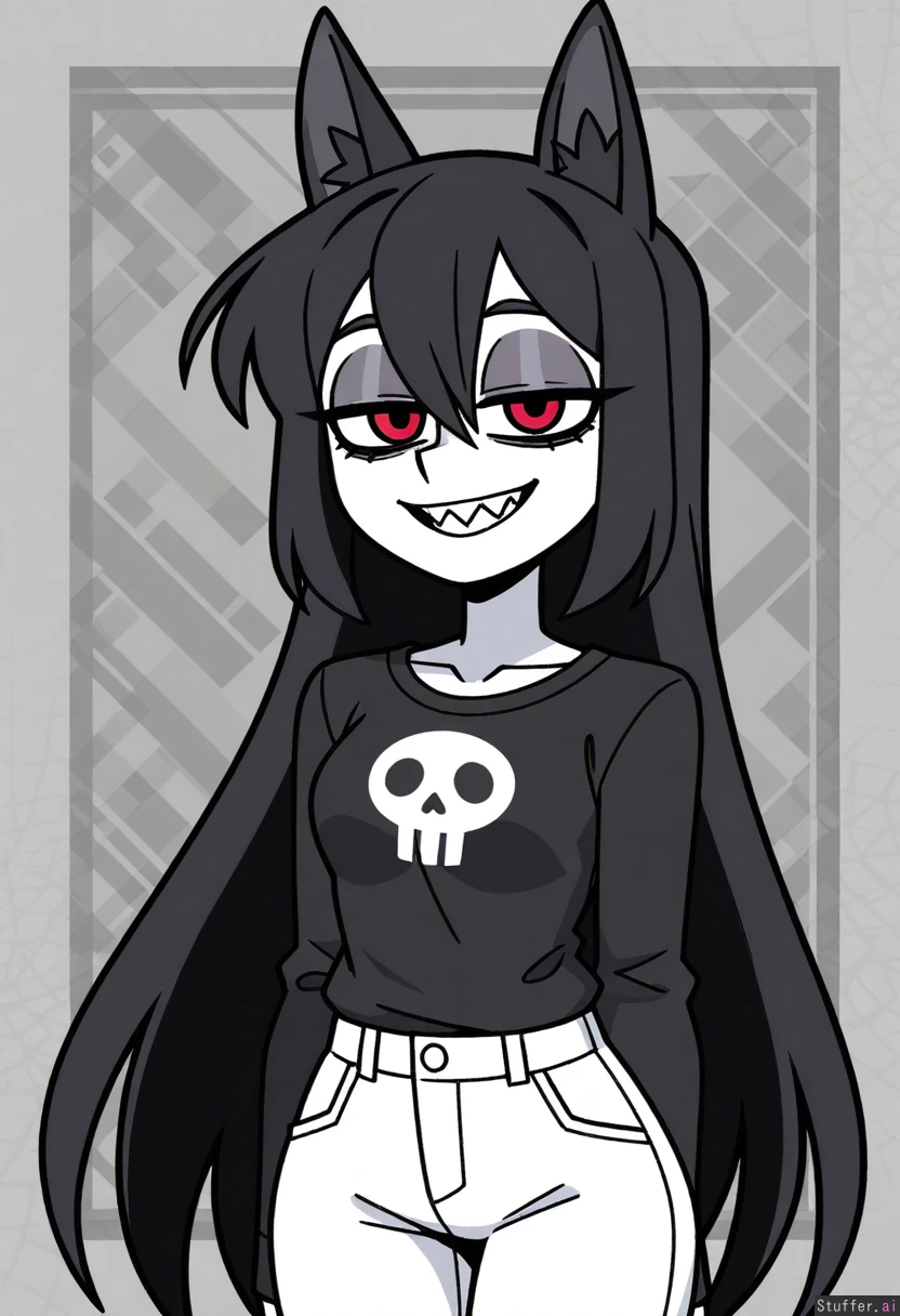 miss circle (fpe), vanripper(artist), white skin, very long spiky black hair, big spiky black anthro ears, black shirt, white jeans, smile with spiky teeth, half liddet eyes