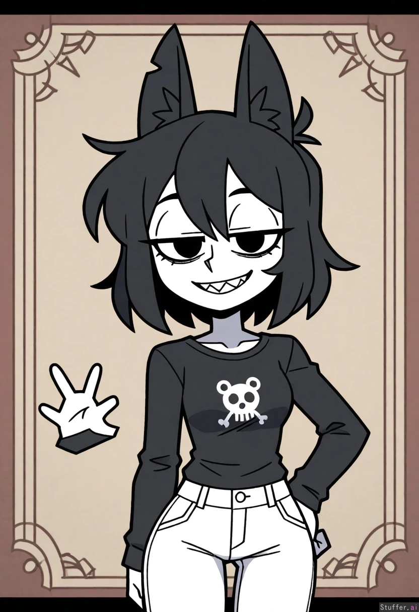 miss circle (fpe), vanripper(artist), white skin, very long super spiky black hair, big spiky black anthro ears, black shirt, white jeans, smile with spiky teeth, half liddet eyes, black eye collor