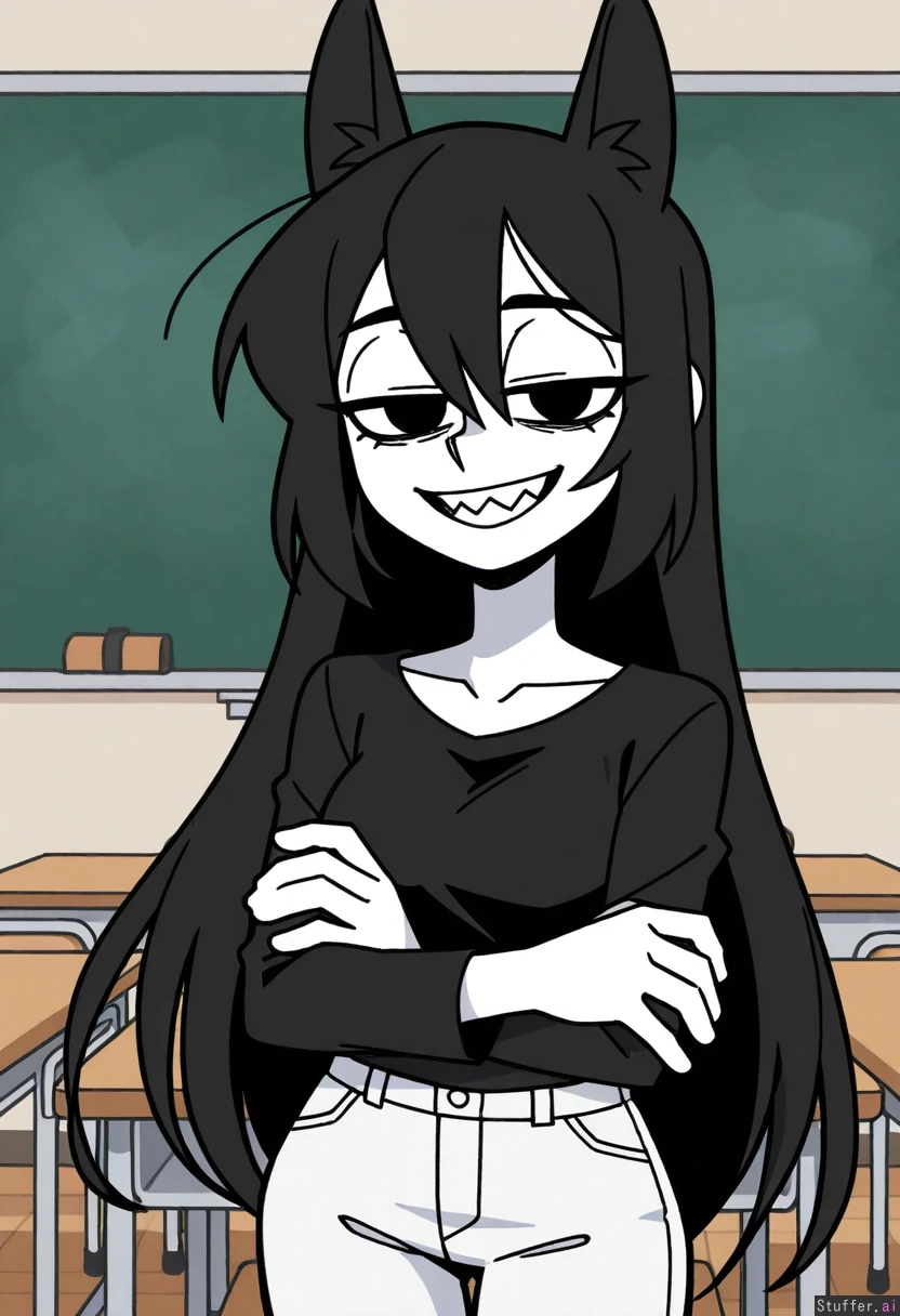 miss circle (fpe), vanripper(artist), white skin, very long super spiky black hair, big spiky black anthro ears, black shirt, white jeans, smile with spiky teeth, half liddet eyes, black eye collor, in a classroom, fully black and white colors