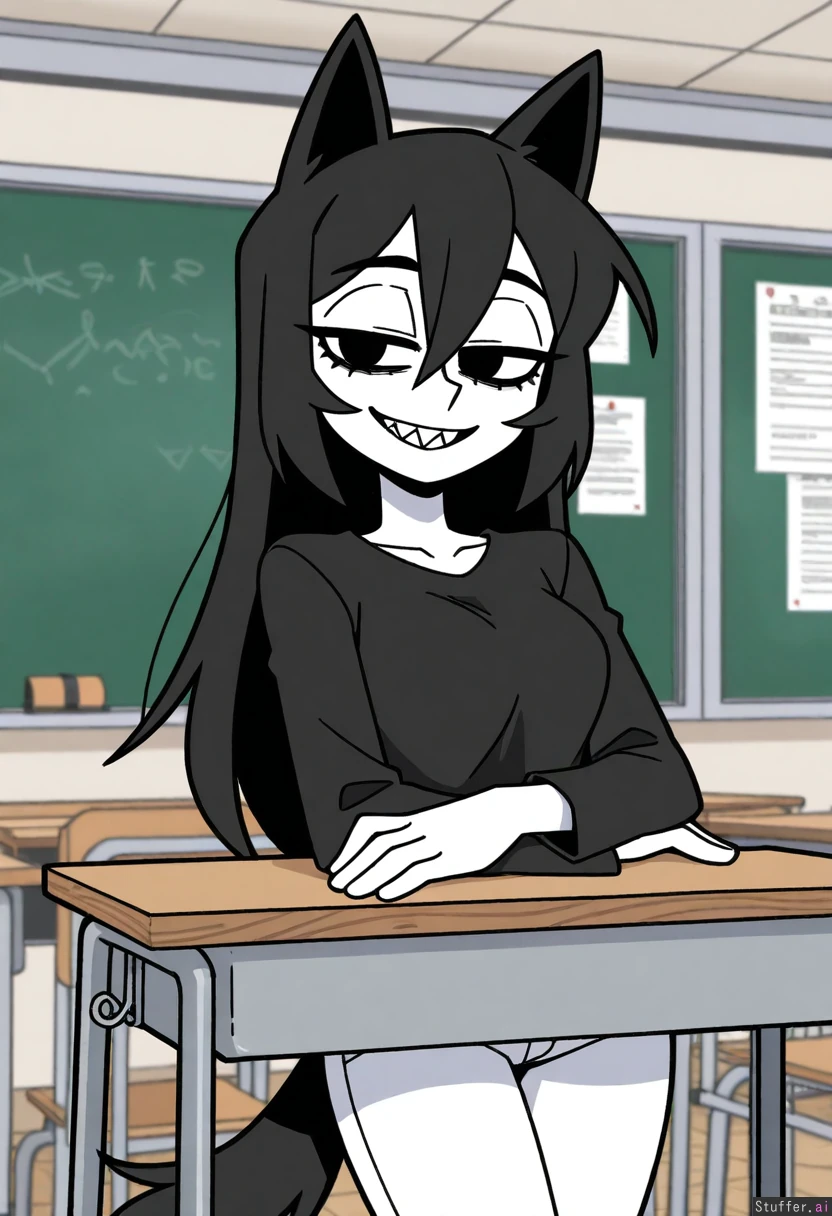 miss circle (fpe), vanripper(artist), white skin, very long super spiky black hair, big spiky black anthro ears, black shirt, white jeans, smile with spiky teeth, half liddet eyes, black eye collor, in a classroom, fully black and white colors