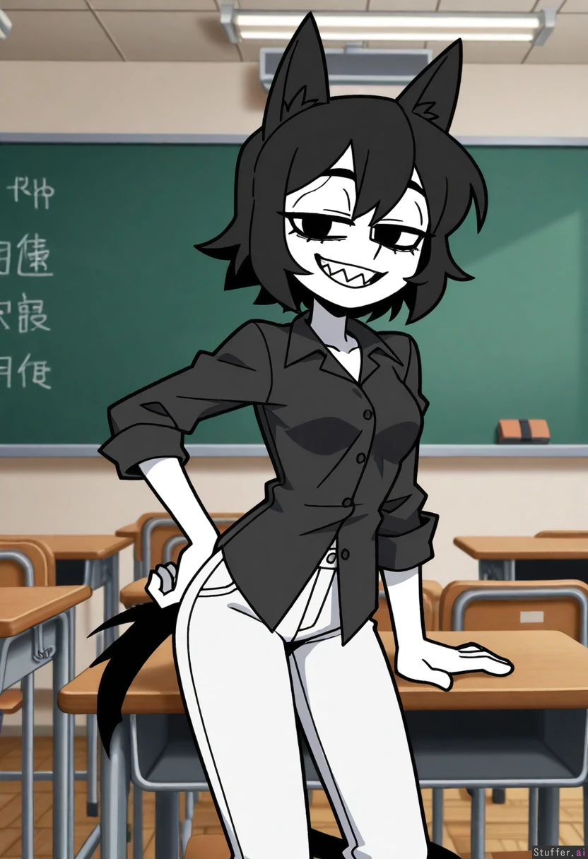 miss circle (fpe), vanripper(artist), white skin, very long super spiky black hair, big spiky black anthro ears, black button shirt, white jeans, smile with spiky teeth, half liddet eyes, black eye collor, in a classroom, fully black and white colors