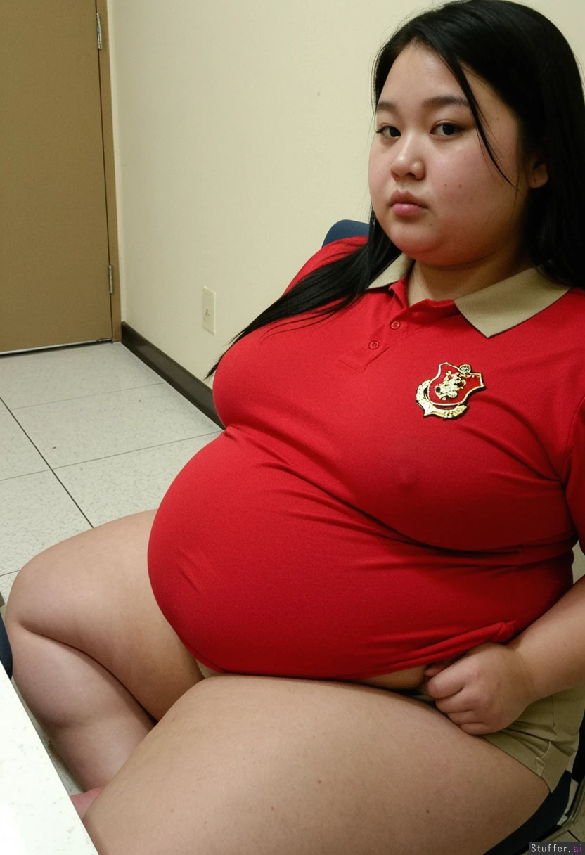 Grainy analog photo from Facebook, flash photograph, dark room, night, close-up, portrait, ((natural very obese barefoot young Chinese girl, student girl), short, fat), pretty, wider features, natural skin, full lips, stunning face, long neck, cheekbones, collarbone, ((red student uniform polo shirt with gold crest, pale, black hair down, khaki skirt, shirt lifted up)), (((big wide belly, fat belly), belly fully visible, cellulite, deep navel, pot belly, wide hips, fat build)), sitting at a table in a cafeteria, side view, (wet glossy glistening skin)