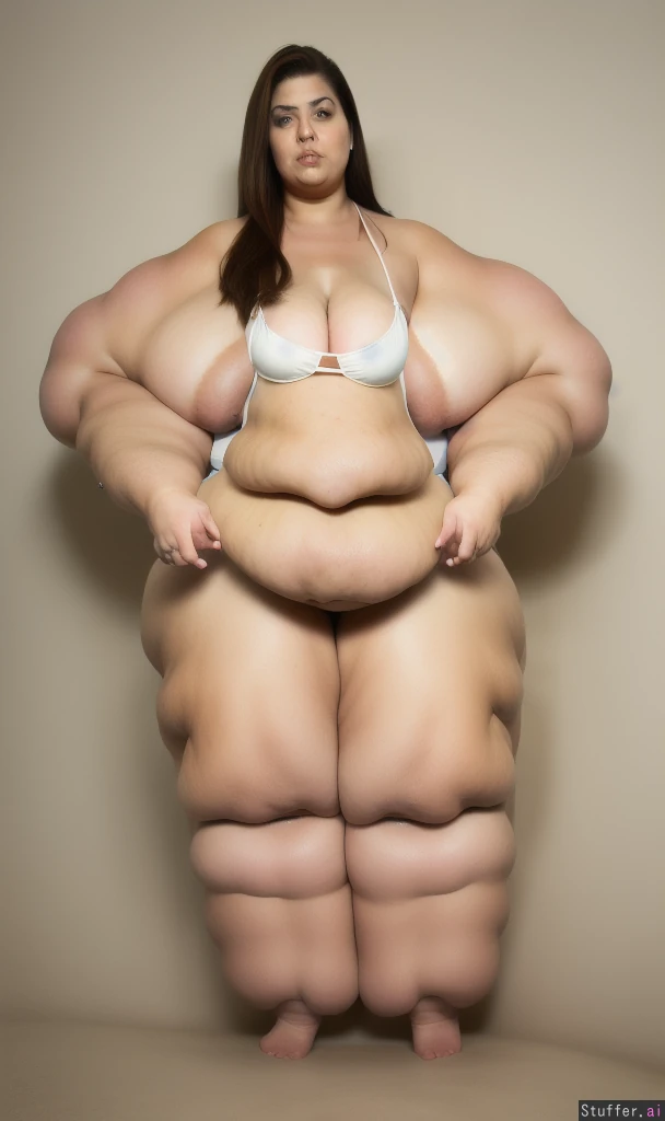realistic, high quality, latina bbw, wearing a white bikini, (brown hair:1.4), (ultra huge arms:1.9), (ultra huge legs:1.9), (ultra leg rolls:1.8), (ultra fat legs:1.8), (ultra arm roll:1.5), bare feet:1.5,