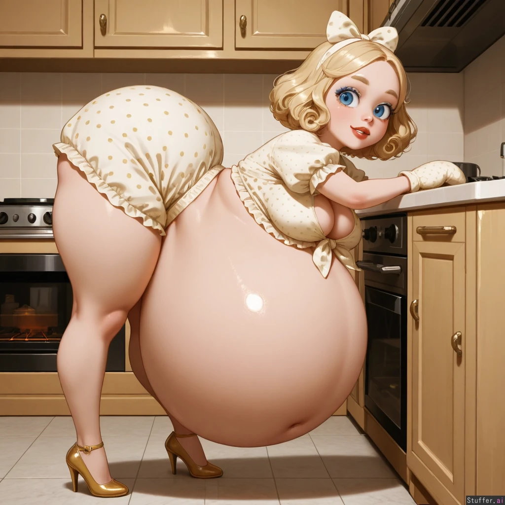 ((Realistic style)), (big eyes:1.2), (red lips:1.4),(blue eyeshadow:1.3), young housewife women ,stunning blue eyes, wavy blonde bob hair with curls, hair bow, sepia toned kitchen, polka dot minidress with puffy sleeves, heels, (((hyper belly, round belly:1.7, belly hang))), cleavage overflow, (doughy waist:1.3), big thighs,(sepia vibe:1.3), (bitting lip:1.4), oven mitts, bending over, side view, realism,