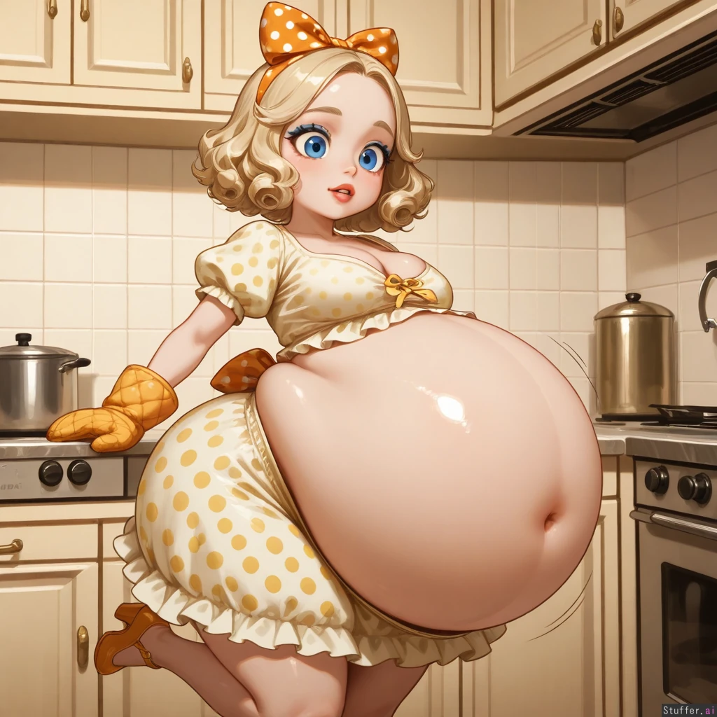 ((Realistic style)), (big eyes:1.2), (red lips:1.4),(blue eyeshadow:1.3), young housewife women ,stunning blue eyes, wavy blonde bob hair with curls, hair bow, sepia toned kitchen, polka dot medi dress with puffy sleeves, heels, (((hyper belly:1.5, belly hang))), cleavage overflow, (doughy waist:1.3), big thighs,(sepia vibe:1.3), (bitting lip:1.4), oven mitts, side view, realism,