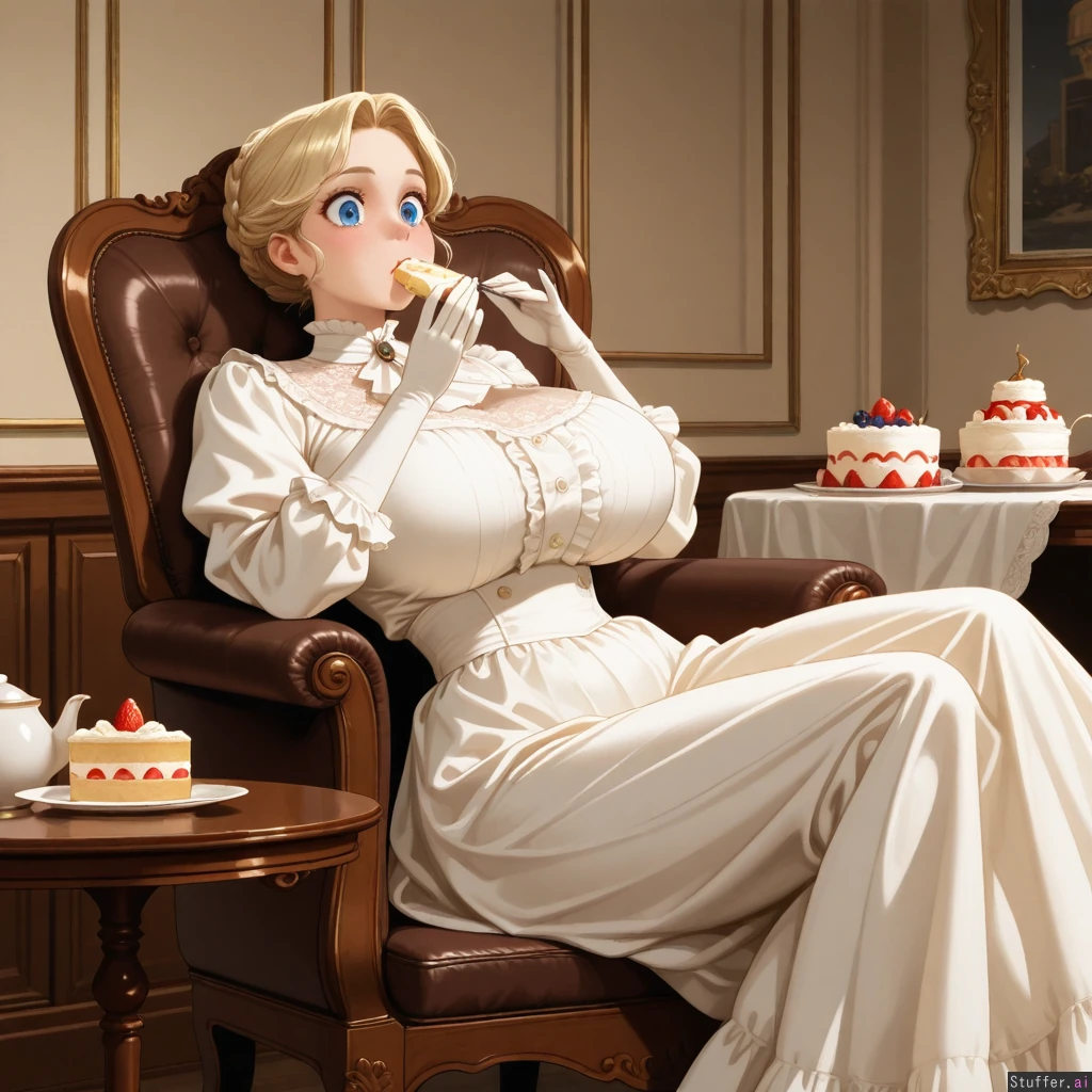 Realistic,(big eyes:1.2),(1950s white madam outfit) ,(fully covered:1.3), in majestic house, (in Victorian aesthetic Composition style:1.4), beautiful princess dress Huge breasts, (doughy waist:1.3), big thighs; noble lady, ((fat princess, round belly:1.0)), wearing elegant gloves, wearing expensive jewelry, spoiled princess, blonde hair, seating behind the dining table, ((eating a cake with her hands)), too many desserts, (reclining back in a chair), hyper cakes,