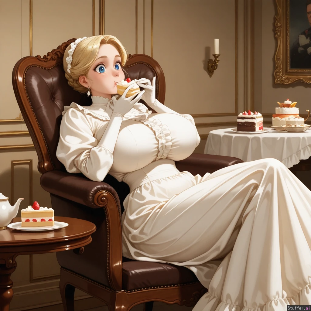 Realistic,(big eyes:1.2),(1950s white madam outfit) ,(fully covered:1.3), in majestic house, (in Victorian aesthetic Composition style:1.4), beautiful princess dress Huge breasts, (doughy waist:1.3), big thighs; noble lady, ((fat princess)), ((round belly:1.0)), wearing elegant gloves, wearing expensive jewelry, spoiled princess, blonde hair, seating behind the dining table, ((eating a cake with her hands)), too many desserts, (reclining back in a chair), hyper cakes,