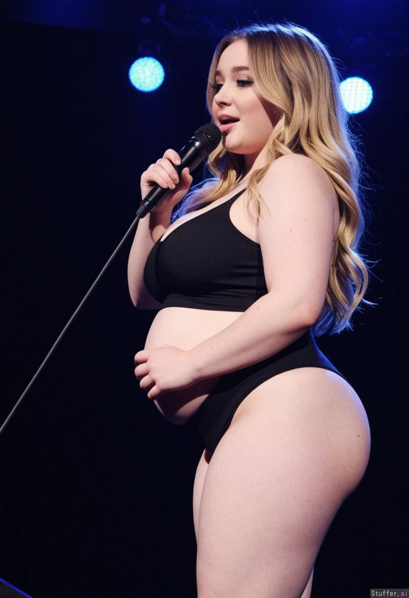Sabrina carpenter in a tight outfit standing on a stage, turned to the side holding a microphone Much chubbier with a soft belly, and a large chubby ass, and heavy fat breasts