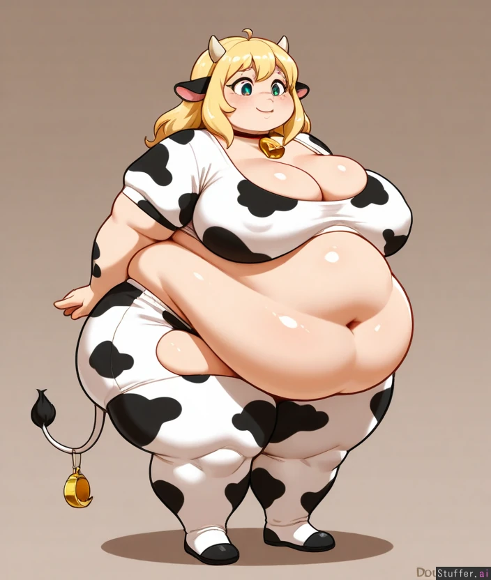 Obese, fat, doughy, heavy, round, feminine, fat_breasts, fat belly, double_belly, extra_thick_thighs, blonde_hair, Feedee, cow outfit