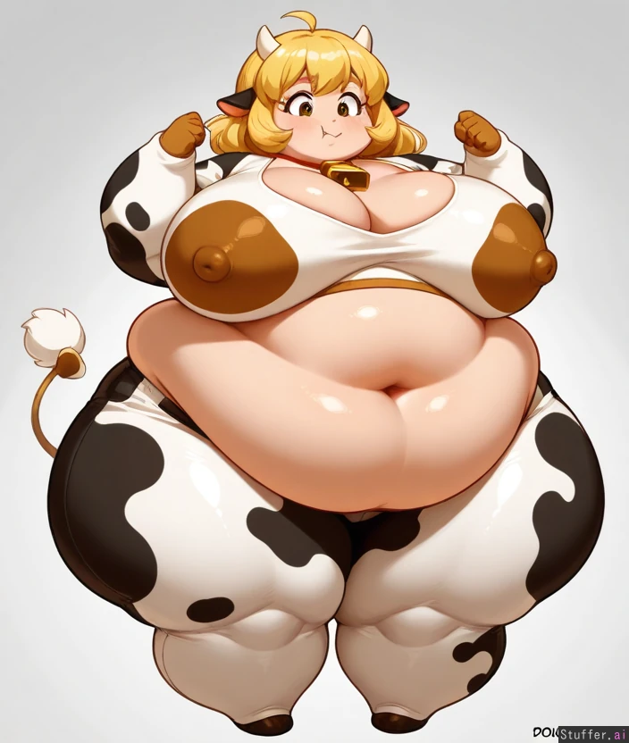 Obese, fat, doughy, heavy, round, feminine, fat_breasts, fat belly, double_belly, extra_thick_thighs, blonde_hair, Feedee, snug cow outfit, eating