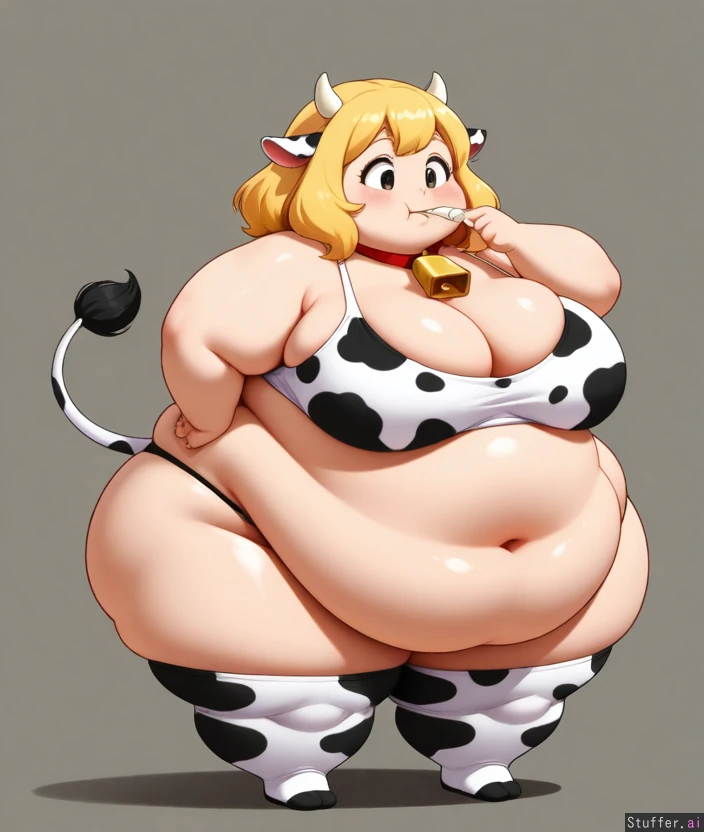 Obese, fat, doughy, heavy, round, feminine, fat_breasts, fat belly, double_belly, extra_thick_thighs, blonde_hair, Feedee, cow outfit, eating