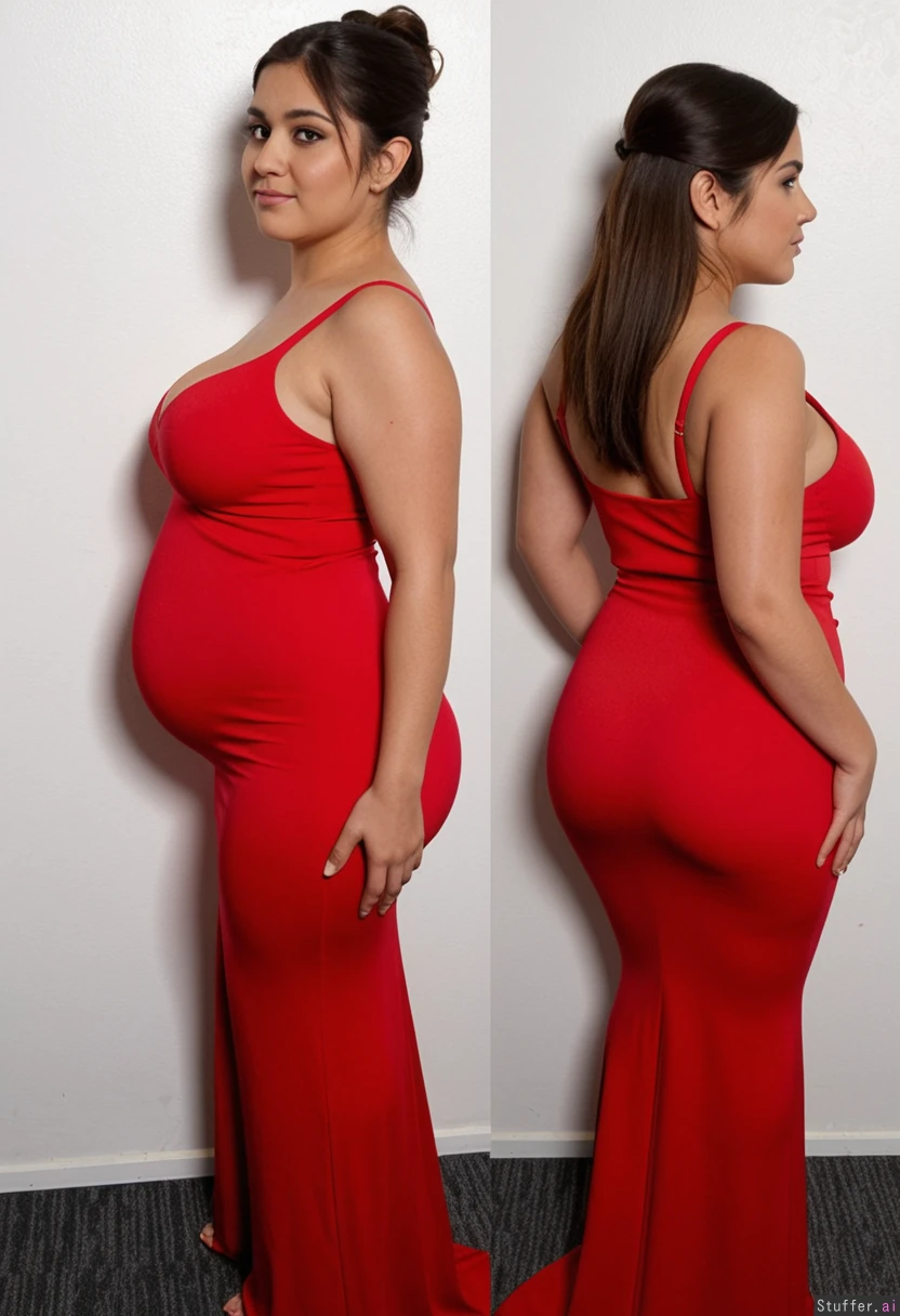 Adult Selina Gomez in a elegant red dress, side view, full body view, a bit chubby, back rolls, soft belly