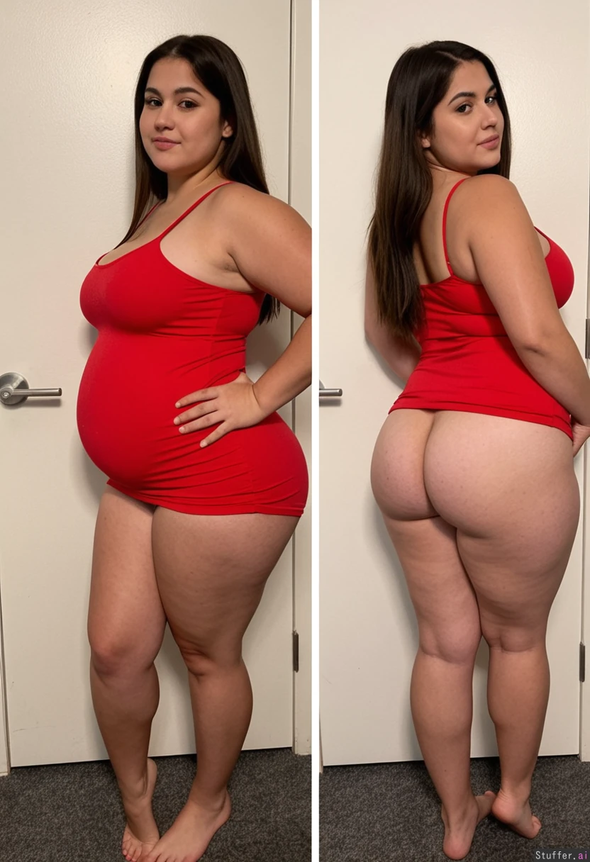 Adult Selina Gomez in a tight red dress, full body view, very chubby, back rolls, soft hanging belly, fat dimpled thighs and butt,