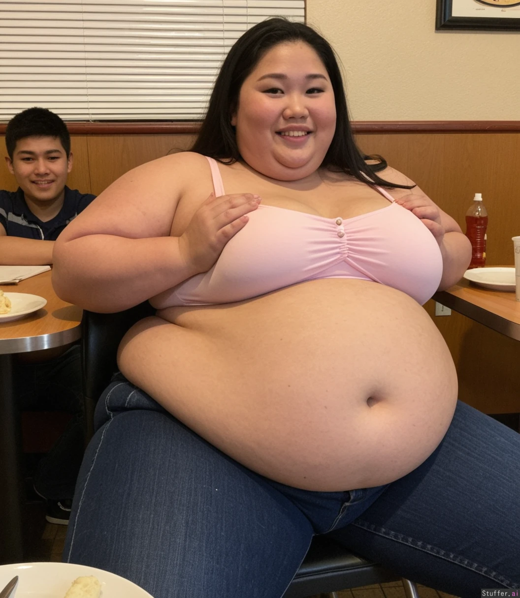 A gigantic morbidly obese ((((Asian)))) woman at a Chinese dim sum restaurant Sitting at a round table with friends, (((((USSBBW))))), Blob woman, Blimp woman, Gigantic sagging double belly, Inflated belly, Bloated puffy fat face, Huge wide butt, Leaning back in her chair holding her belly with her hands feeling aroused by being full and stuffed, Smiling, Pants unbuttoned, Gigantic double-chin, Wearing denim jeans and a light pink camisole, Non-nude, Viewed from front , Wide shot, Well lit area