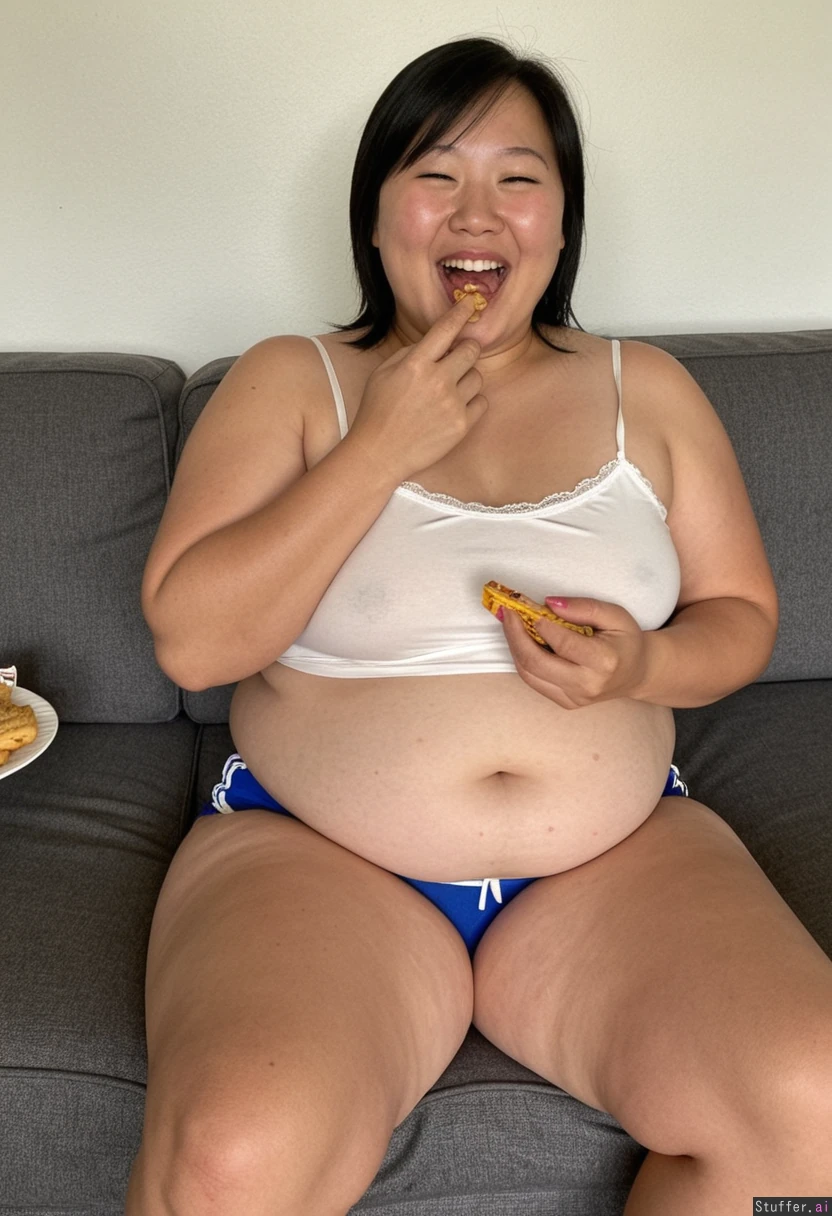 A ((((((((chubby)))))))) (((((Asian))))) middle-aged woman sitting on a small couch putting snacks into her mouth,