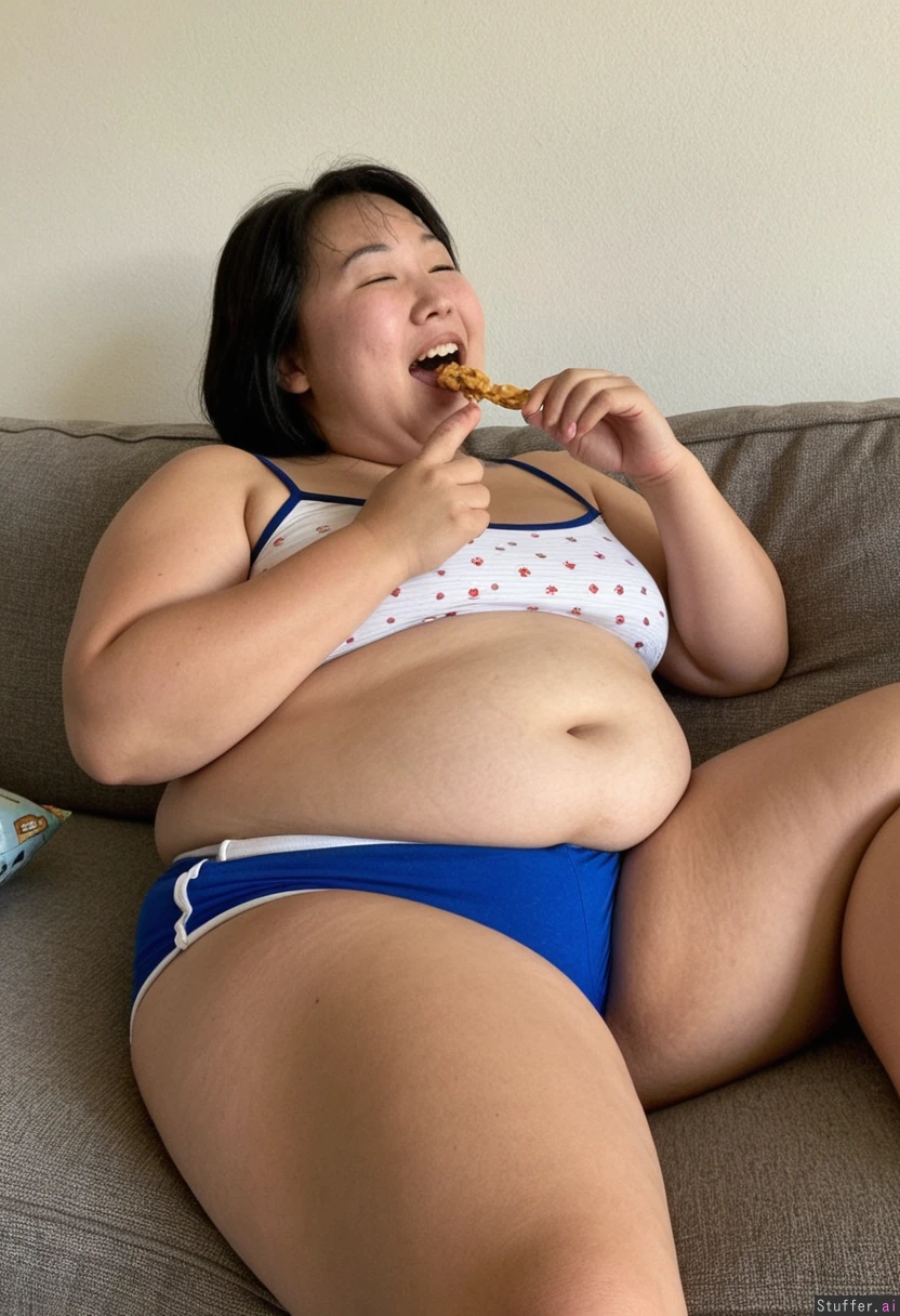 A ((((((((chubby)))))))) (((((Asian))))) middle-aged woman laying on her side on a small couch putting snacks into her mouth, wearing shorts and a camisole, Laughing, Natural lighting
