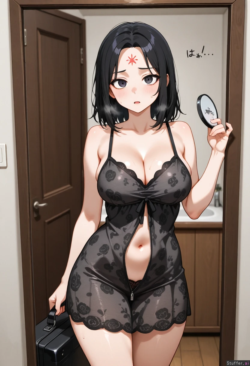If she was going to do this, she wasn't going to show up looking like a sweaty, defeated slob. She was going to dress nice. The phrase itself was a joke. Her wardrobe, packed into a single large suitcase and the tiny dorm closet, was a monument to shapeless comfort. But she knew, buried at the very bottom of the suitcase, was a relic from another lifetime. A "just in case" dress. Just in case she was ever invited to a wedding. Just in case she ever had a reason to look like a normal human being again. She hauled the suitcase onto the bed and unzipped it. After digging through layers of soft, stretched-out cotton, her fingers brushed against a different texture. Silk. She pulled it out. It was a dark floral wrap dress, something shed bought five years and at least a hundred and fifty pounds ago. Holding it up, it looked like a doll's costume. It was beautiful. It was impossible. It was perfect. Taking it into the tiny bathroom, she stripped off her t-shirt and panties and stood before the narrow, wall-mounted mirror. The sight was overwhelming. A huge, pale landscape of flesh. Breasts like massive, drooping sacks of flour, a belly that cascaded down in thick, doughy rolls, hips that were staggeringly wide, and an ass that seemed to defy the laws of physics. She stepped into the dress. That was the easy part. The challenge began when she tried to pull it up. The delicate fabric snagged on the vast plains of her hips. She had to wiggle and shimmy, her soft flesh jiggling violently with the effort. She finally got it past the peak of her ass, the material stretched so tight it was a second skin. Now for the wrap. She took one side and pulled it across the front of her body. It barely reached the center of her colossal gut. She took the other side and pulled with all her might. The fabric strained, the pattern distorting over the immense curve of her stomach. The fabric tie, meant to cinch elegantly at her waist, was miles away from its corresponding loop. She grunted, sweat beading on her forehead. This was more of a workout than walking across campus. She sucked in her guta futile gesture that barely made a differenceand pulled again. Her fingers, pudgy and clumsy, fumbled with the tie. She managed to thread it through the loop, but when she tried to pull it tight and tie a bow, it was hopeless. The two ends of the tie were comically short, barely able to meet, let alone form a knot. She looked in the mirror. The sight was both grotesque and electrifying. The dress was a battlefield, and her body was winning the war. The V-neck, designed to be a modest plunge, was a gaping chasm, barely containing the swollen, heavy globes of her breasts, which were crushed together and pushed upwards, spilling out of the top. The fabric was stretched to the point of transparency over her belly, every soft roll and the deep crater of her navel perfectly, obscenely delineated. The slit of the wrap, meant to flash a bit of thigh, was pulled wide open, exposing the thick, dimpled column of her leg almost to her hip. The dress ended mid-thigh, but her enormous ass stretched it upwards in the back, leaving the lower half of its heavy, fleshy curve completely exposed. It was a disaster. It was indecent. And she was going to wear it. It was a statement. You think I'm fat, Chloe? Here. Fucking look at me. See all of it. She wouldn't hide. She would weaponize it. She found a pair of black leggingsher newest pair, the fabric still dark and opaqueand wrestled them on under the dress to preserve some shred of public decency. The leggings vanished beneath the swell of her gut, but they covered her legs. It would have to do. She spent twenty minutes on her hair and makeup, a strange, surreal ritual of painting a pretty mask onto a face she barely recognized. When she was done, she stared at her reflection. A huge, soft woman, crammed into a dress that was screaming for mercy, her face carefully made up, a defiant, terrified glint in her eyes. She looked insane. She looked powerful. She took a deep breath, the dress cutting painfully into her ribs, and walked out the door.