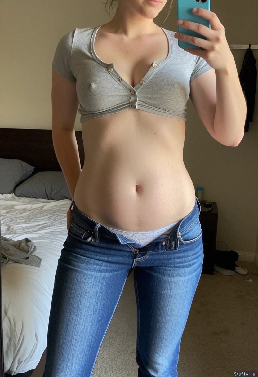 Cobie Smulders is standing in her bedroom with her pants unbuttoned, showing off her stuffed belly and taking a selfie. She is wearing a short-sleeve top that shows just the lower part of her belly, and unbuttoned blue jeans that expose the cotton panties she is wearing underneath. She appears to have a thin, healthy figure, but with a slightly chubby, bloated pot-belly. The button on her jeans is undone, and her pants are open wide enough to show the cotton panties she has on underneath. (Cobie_Smulders)(Unbuttoned_jeans)