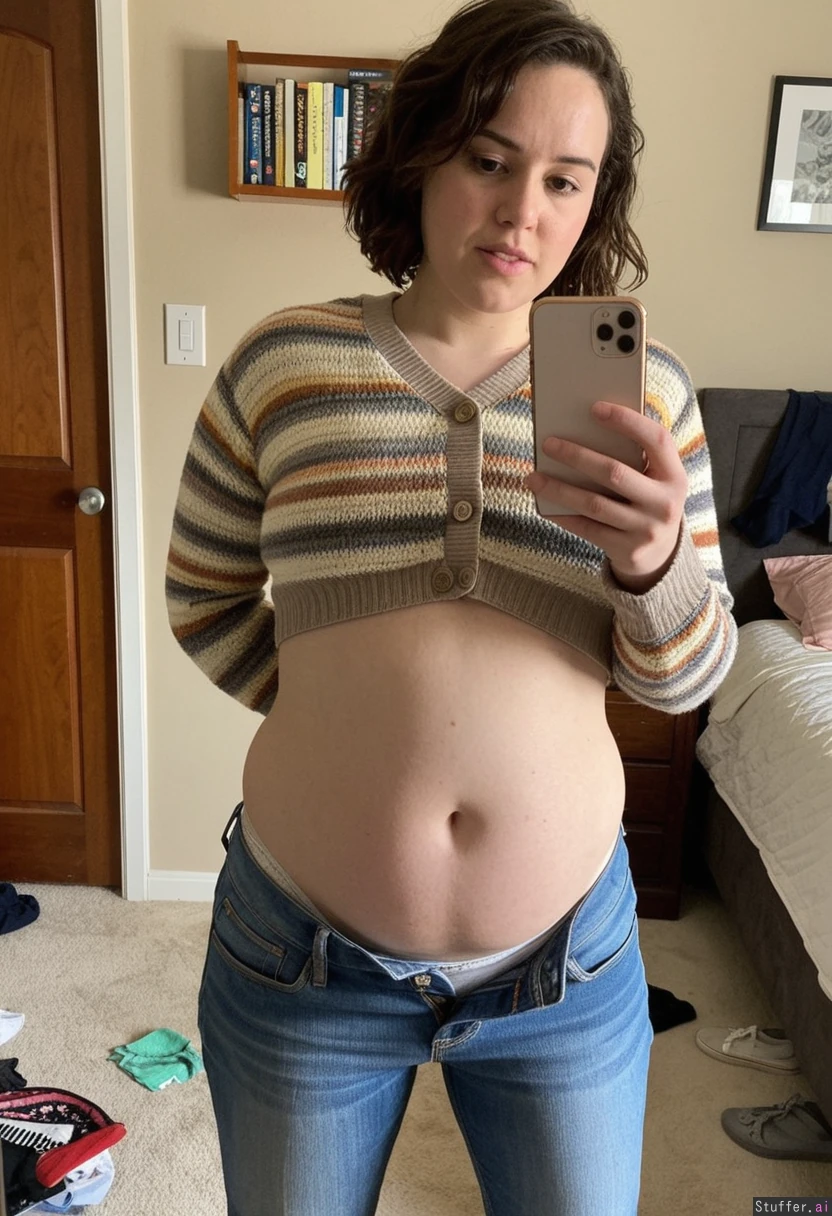 Daisy Ridley is standing in her bedroom with her pants unbuttoned, showing her stuffed belly and taking a selfie. She is wearing a cropped sweater with stripes, and unbuttoned blue jeans that expose the cotton panties she is wearing underneath. She appears to have a normal, healthy figure, but with a slightly chubby, bloated pot-belly. The button on her jeans is undone, and her pants are open wide enough to show the cotton panties she has on underneath. Her bedroom looks like a typical girls bedroom, with some clothes littering the floor. ((Daisy_Ridley))(Unbuttoned_jeans)(bloated_belly)(slightly_chubby_belly)(girls_bedroom_decor)(closet)(wall_art)(books)