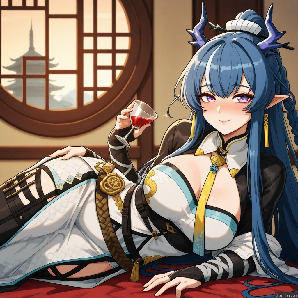 Masterpiece, UHD, HDR, intricate detail, absurd resolution, solo, absurd details, absurd anatomy, (Kinkymations(artist):0.8), ling_(arknights):1.2, drunk:1.3, (tall beatiful mature woman with medium breasts), (ling outfit), (operator outfit), pagoda background, drinking alcohol, floating bubbles aroud head, heavy blushing, lying at ground, showing breasts, horny:1.2, seductive, (internal wormhole)